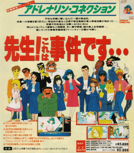『アドレナリン・コネクション』は、1987年末にパソコン用に発売されたアドベンチャーゲームです。『プロセルピア』などを開発していたアモルファスが企画・開発を担当し、ビクター音楽産業が発売・販売を担当していたようです。