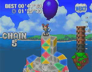ブロックが増殖すると、キャラクターの頭上に『幸せの風船』が出現します。この風船は一定時間で破裂してしまいますが、それまでに違うブロックの色を合わせることで『連鎖』が成立して、だんだんとふくらんでいきます。連鎖が終了するとボーナスとしてブロックが出現しますが、連鎖数が大きいほど数が多くなります。
